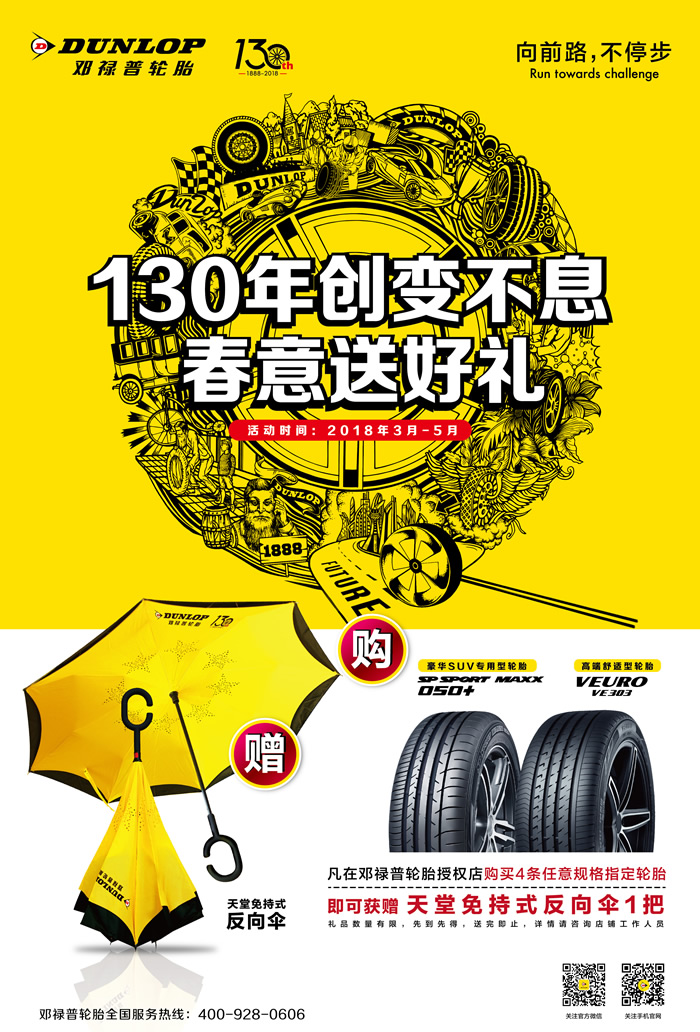 值此130周年慶典之際,為了回饋廣大車主對鄧祿普的厚愛與支持,鄧祿普將在全國范圍內(nèi)推出“春意送好禮”促銷活動:2018年3月至5月,消費(fèi)者前往鄧祿普指定門店購買4條SP SPORT MAXX 050+或VEURO VE303輪胎,即可獲贈印有紀(jì)念LOGO的定制版天堂免持式反向傘,無論風(fēng)雨,鄧祿普都將與車主一路相伴。
